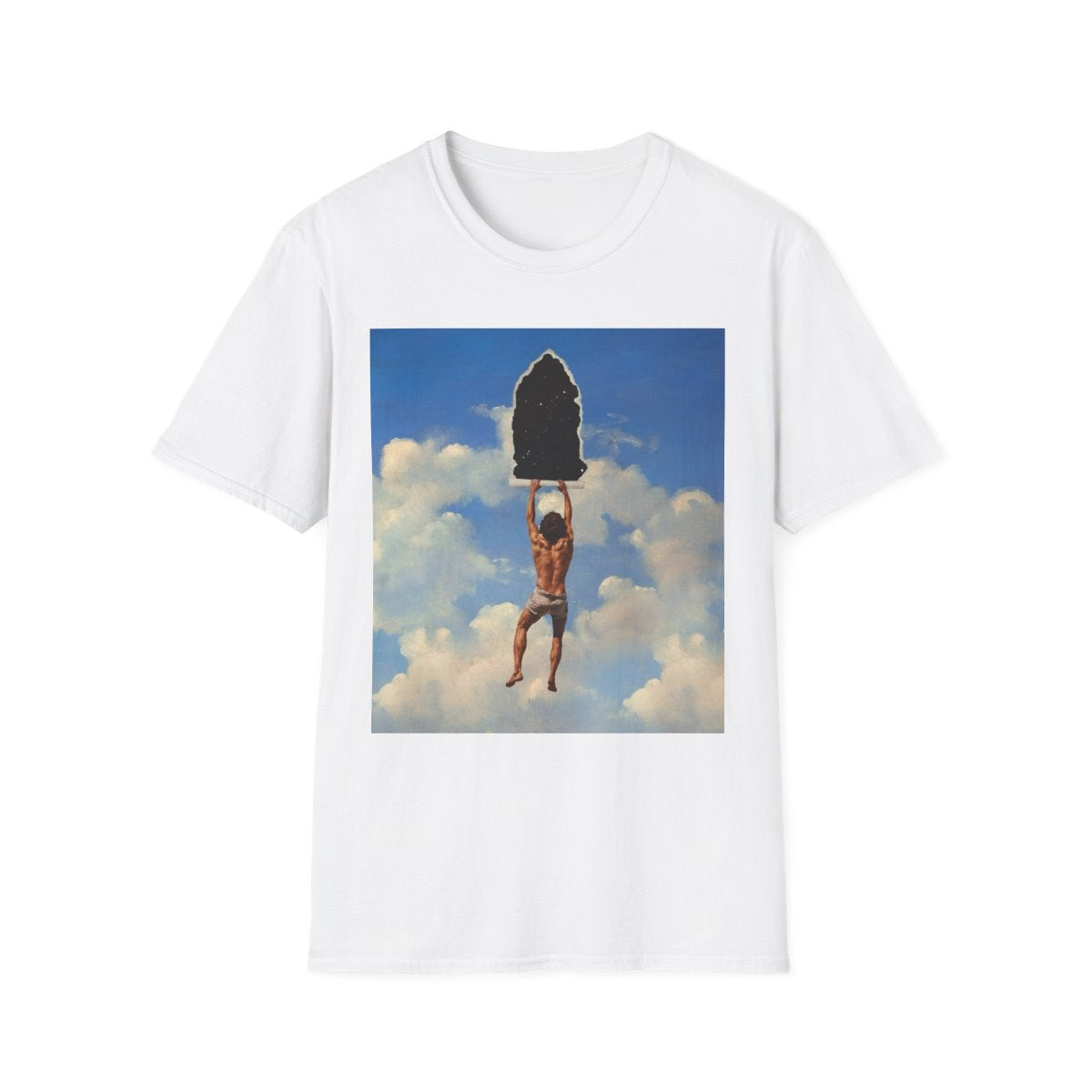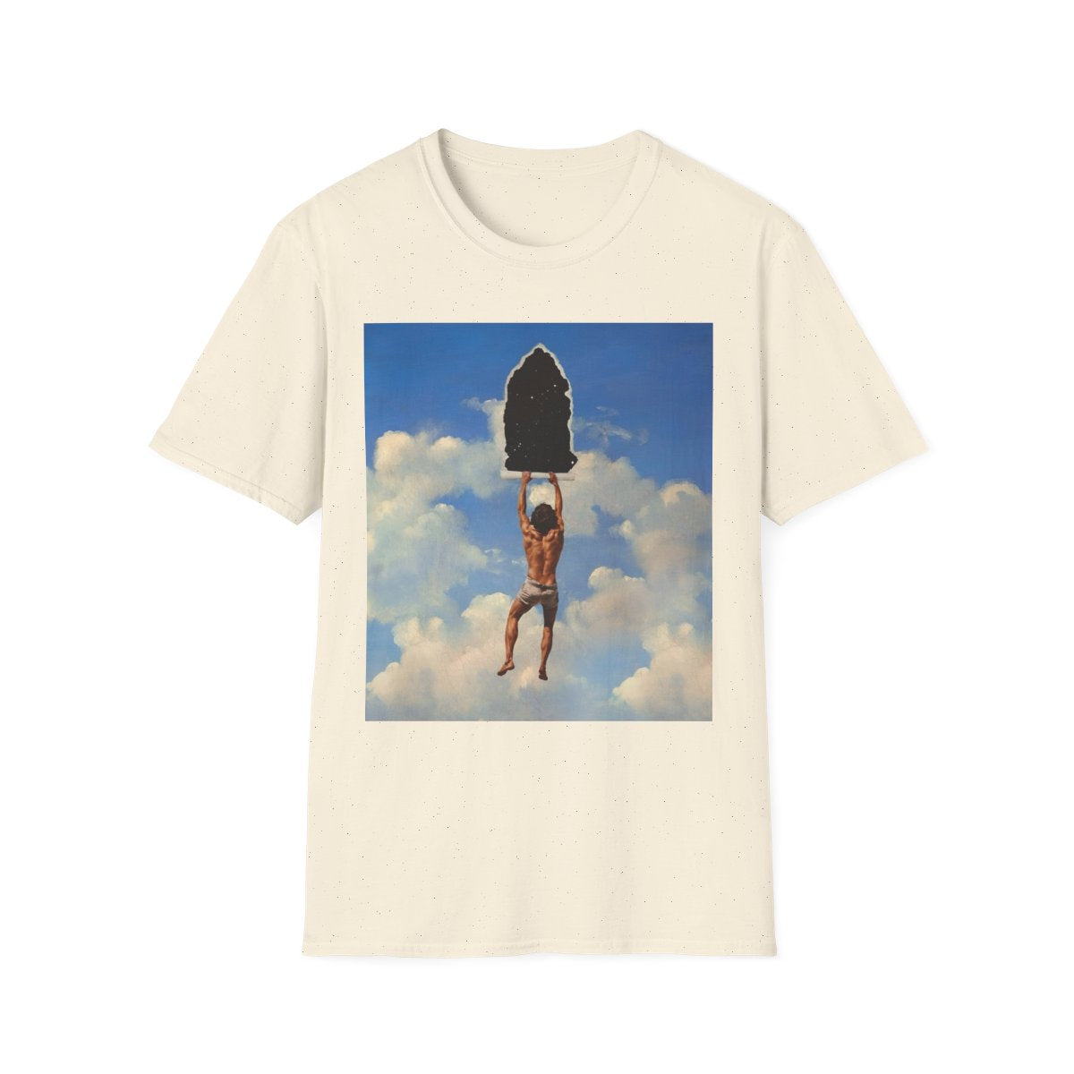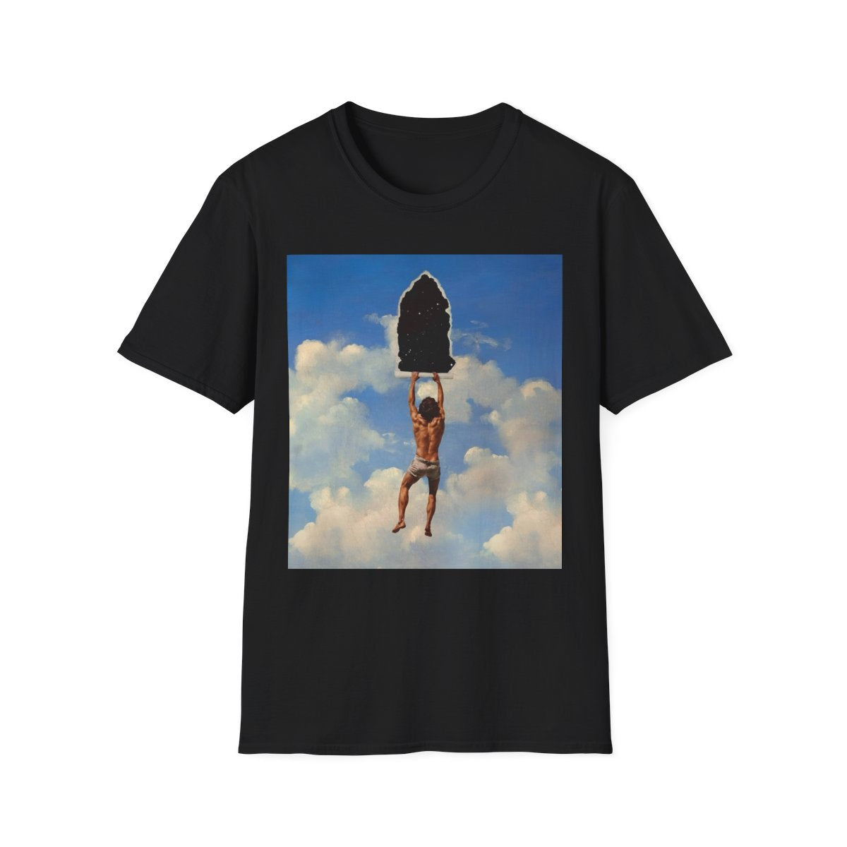 The cracked texture overlay gives the image the feel of a timeless artifact, emphasizing the fragile nature of reality and the artistry of representation. Inspired by surrealism and metaphysical thought, this design is a powerful metaphor for discovery, questioning what lies behind the surface of everyday life and inviting wearers to embrace audacity, curiosity, and wonder.