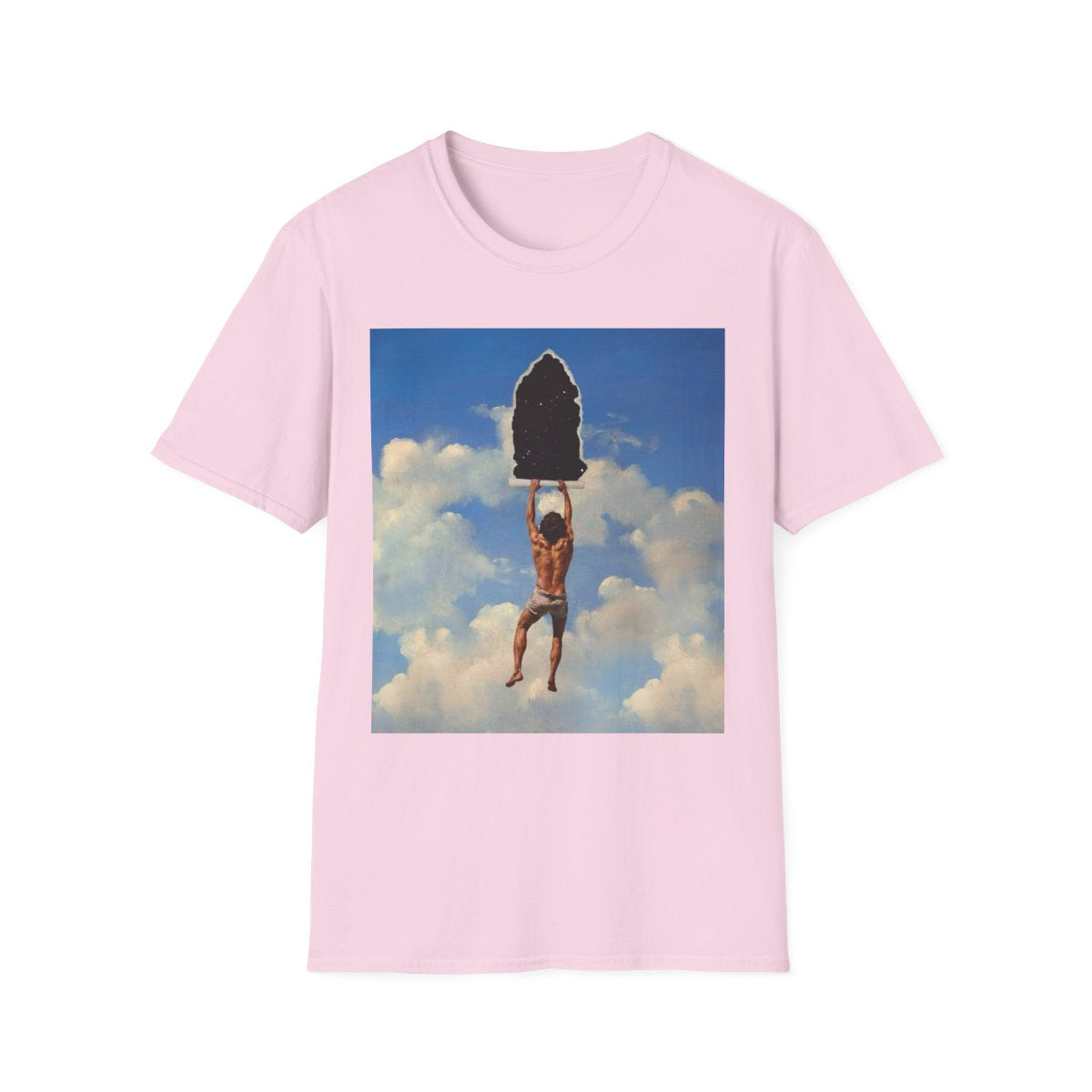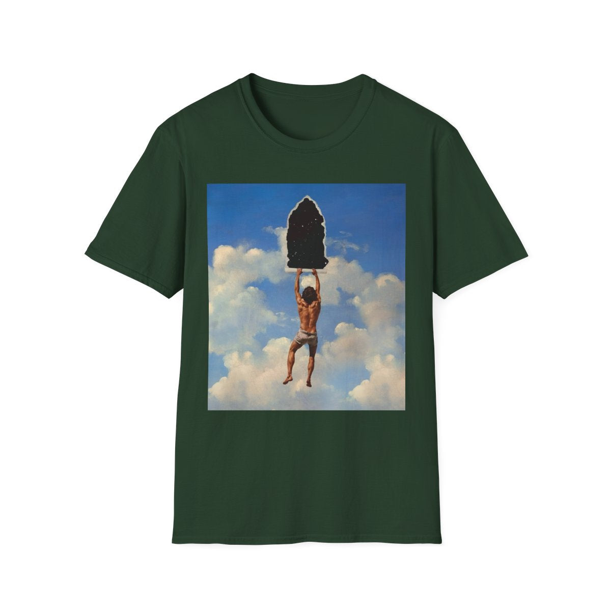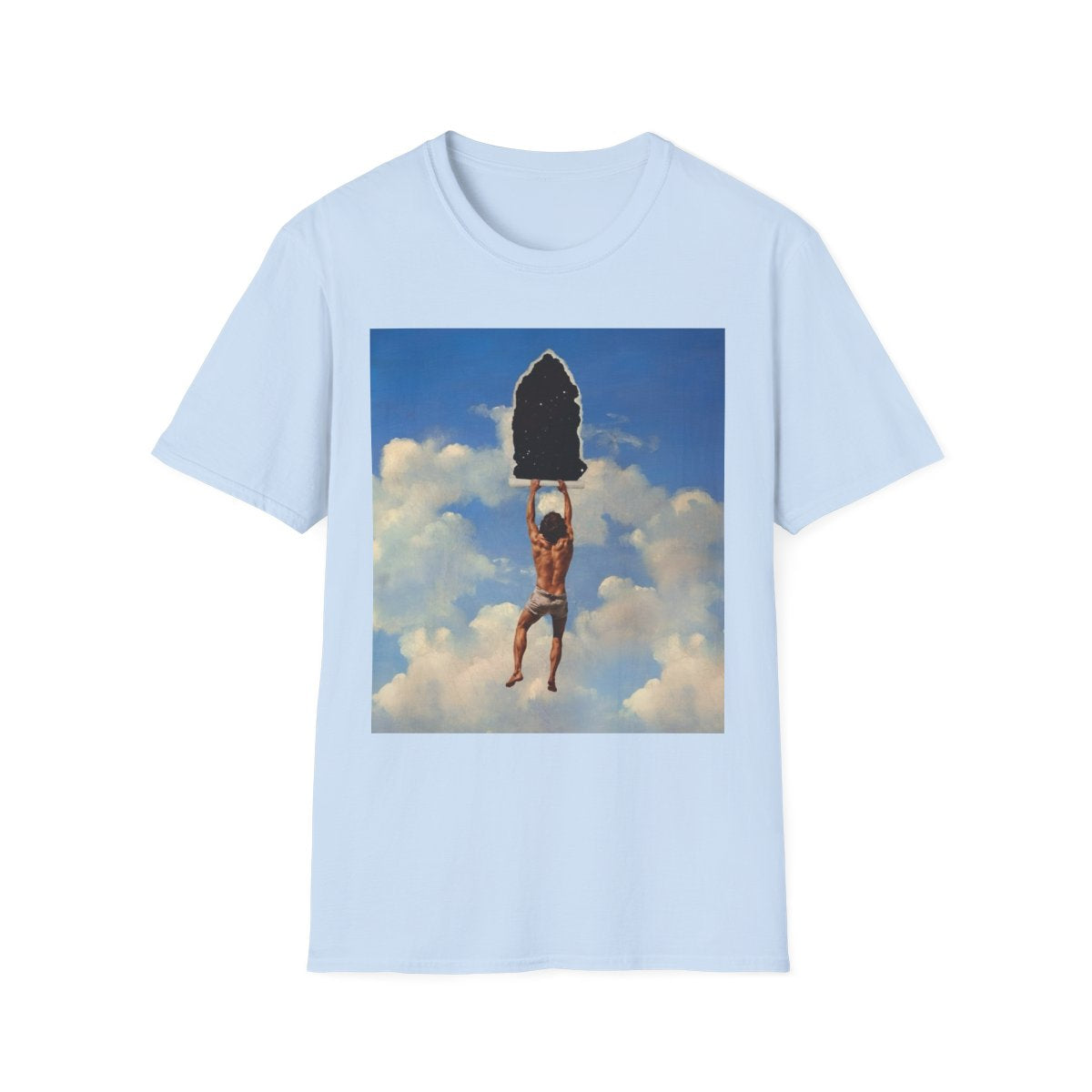The cracked texture overlay gives the image the feel of a timeless artifact, emphasizing the fragile nature of reality and the artistry of representation. Inspired by surrealism and metaphysical thought, this design is a powerful metaphor for discovery, questioning what lies behind the surface of everyday life and inviting wearers to embrace audacity, curiosity, and wonder.